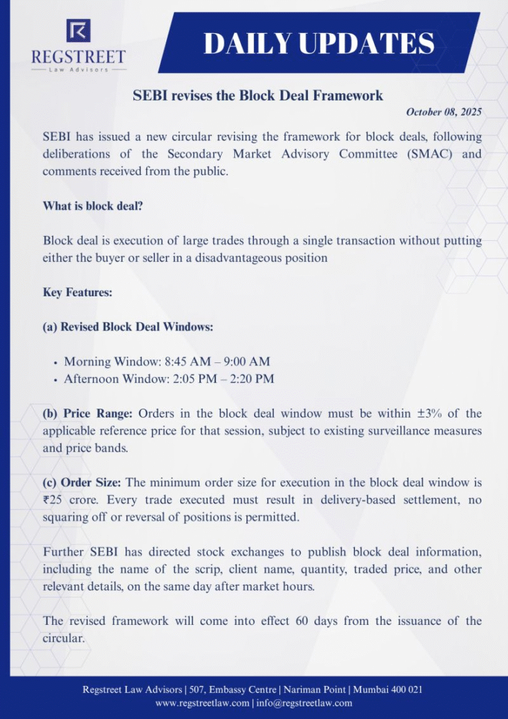SEBI has issued a new circular revising the framework for block deals, following deliberations of the Secondary Market Advisory Committee (SMAC) and comments received from the public.